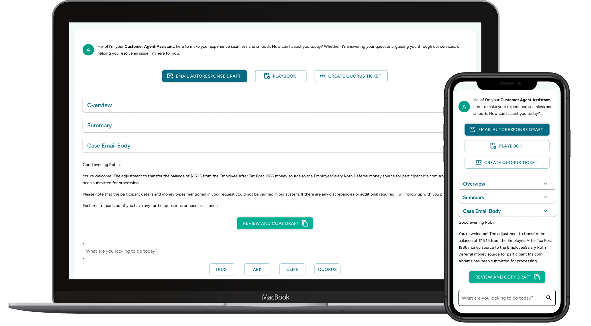 Streamlined case and ticket creation directly from the assistant interface, eliminating context-switching.